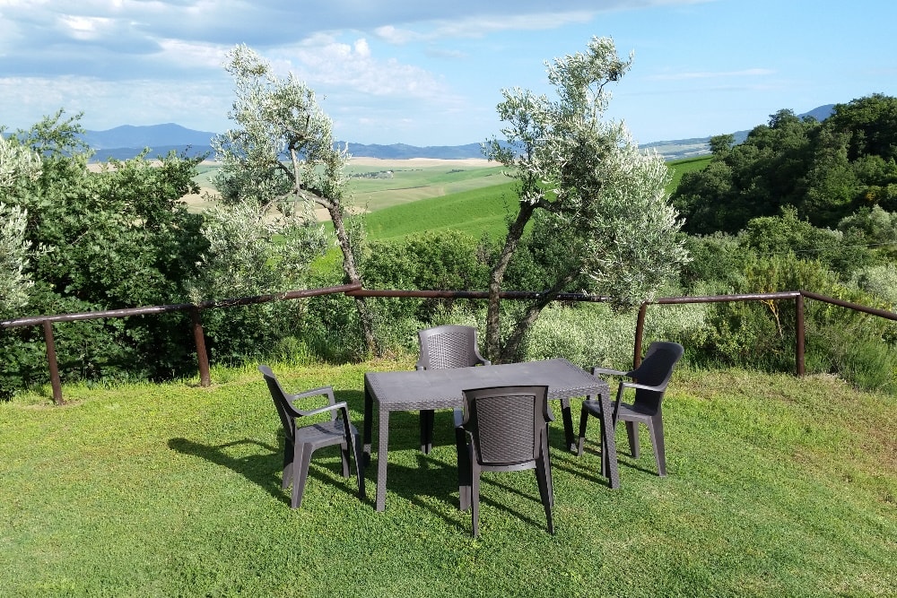 The Granaio della Fonte is surrounded by a large garden, with olive trees and a weeping willow where you can shelter from the sun, relax for an outdoor picnic, sunbathe, enjoying a wonderful view over the countryside of Val d'Orcia.